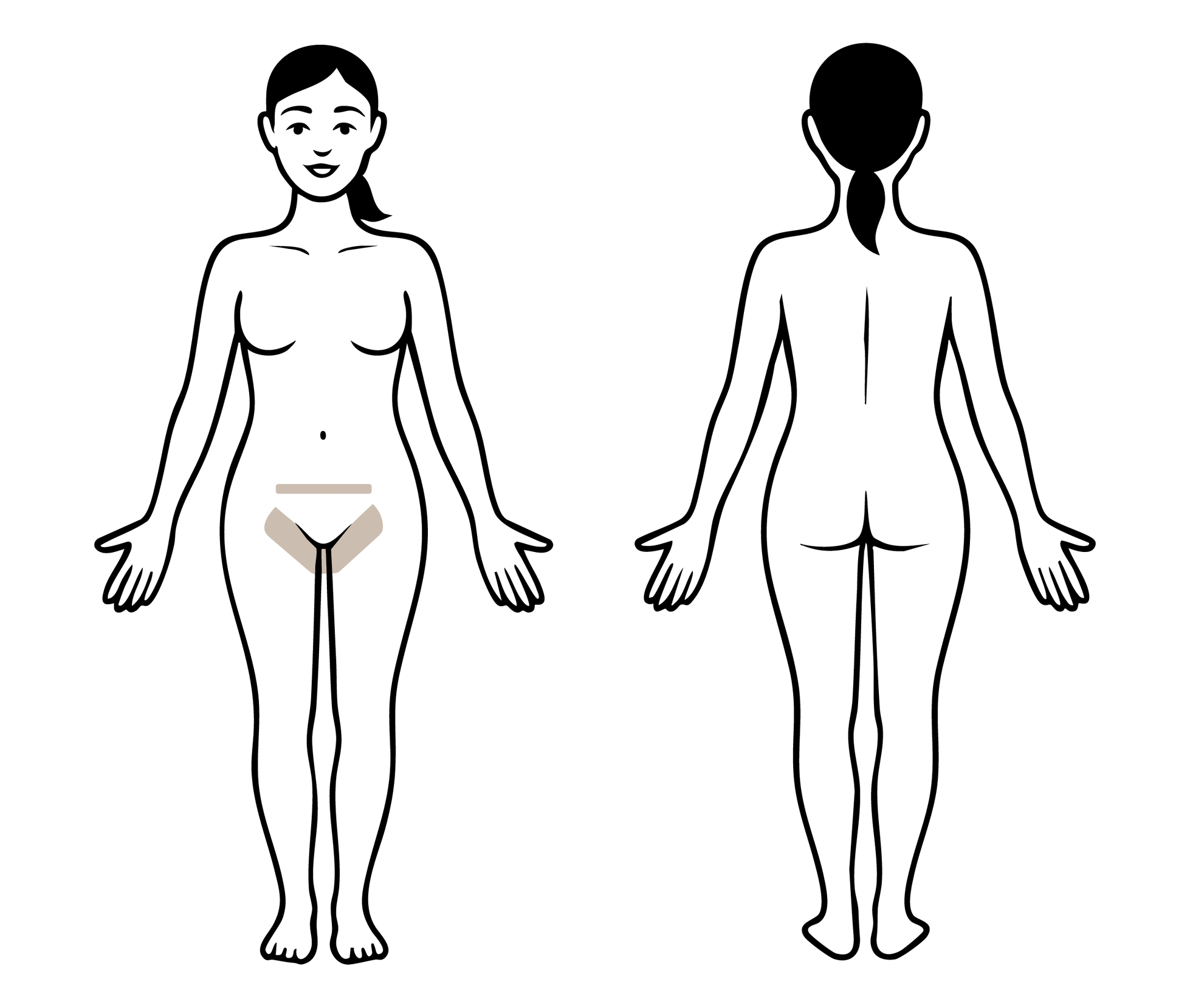 Removal of anything or everything from the front while excluding the back (excluding the butt strip). We also offer Bikini Line: Hair removal around the panty line, extending four fingers outward from panty line and two fingers off from the top. The goal is to achieve a tidy and well-defined bikini line. Our newest wax service is the Deep Bikini: extends beyond a standard bikini line wax to achieve a very neat, well-groomed and tidy appearance.